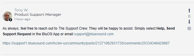 As always, feel free to reach out to The Support Crew. They will be happy to assist. Simply select Help, Send Support Request in the BluOS App or email support@bluesound.com