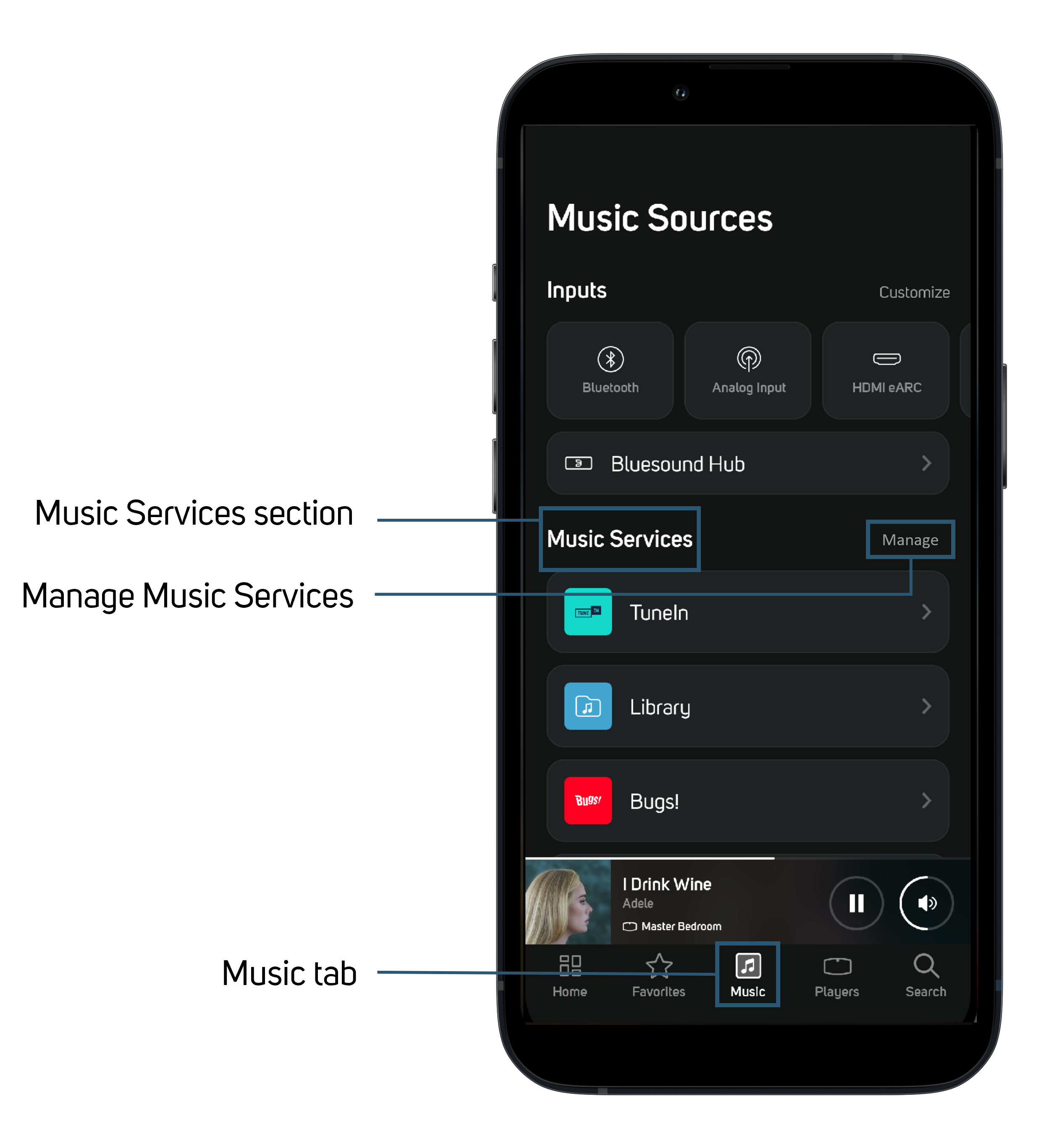 - Launch the BluOS Controller app; under the left Navigation Drawer, select Music Services - Manage.