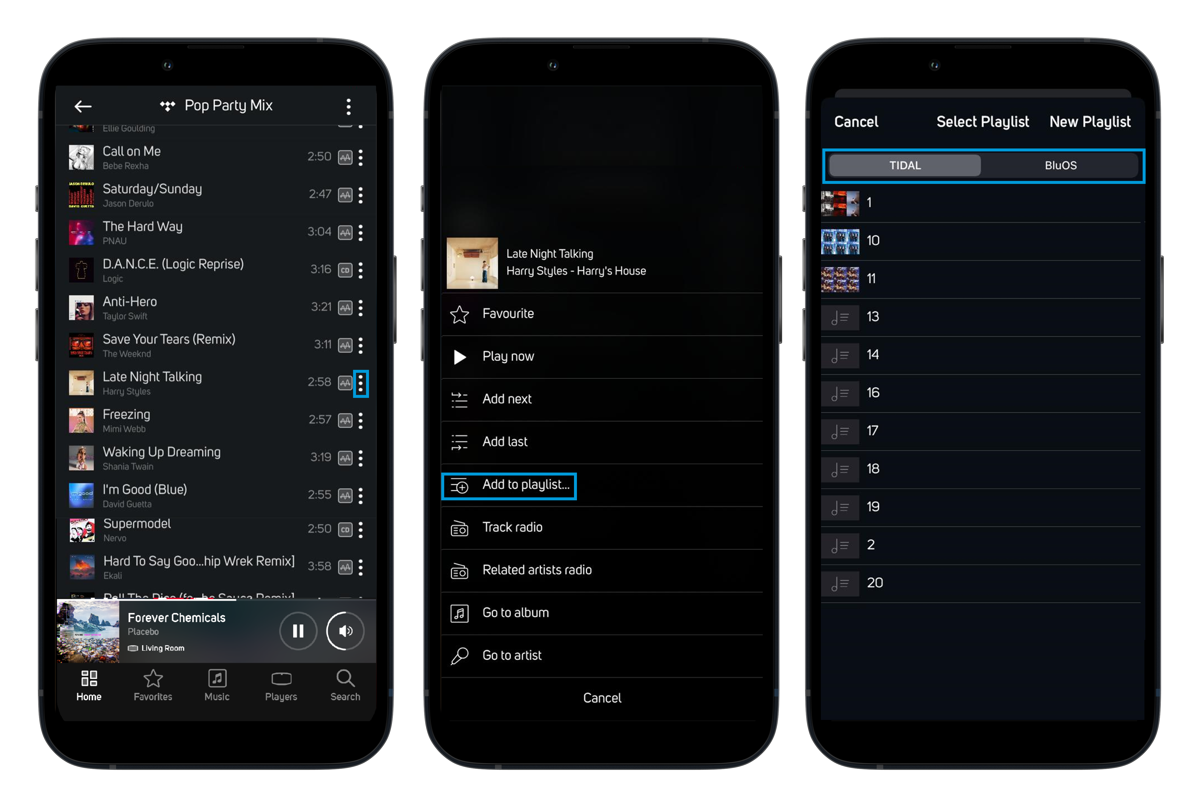 Note: If saved to BluOS, the playlist can include music from various Music services and your local library. However, it will only be accessible through the BluOS Controller app from the Home tab. Alternatively, saving the track/song to the Music Service Playlist enables access within its application but restricts additions to content exclusive to that particular Music Service.