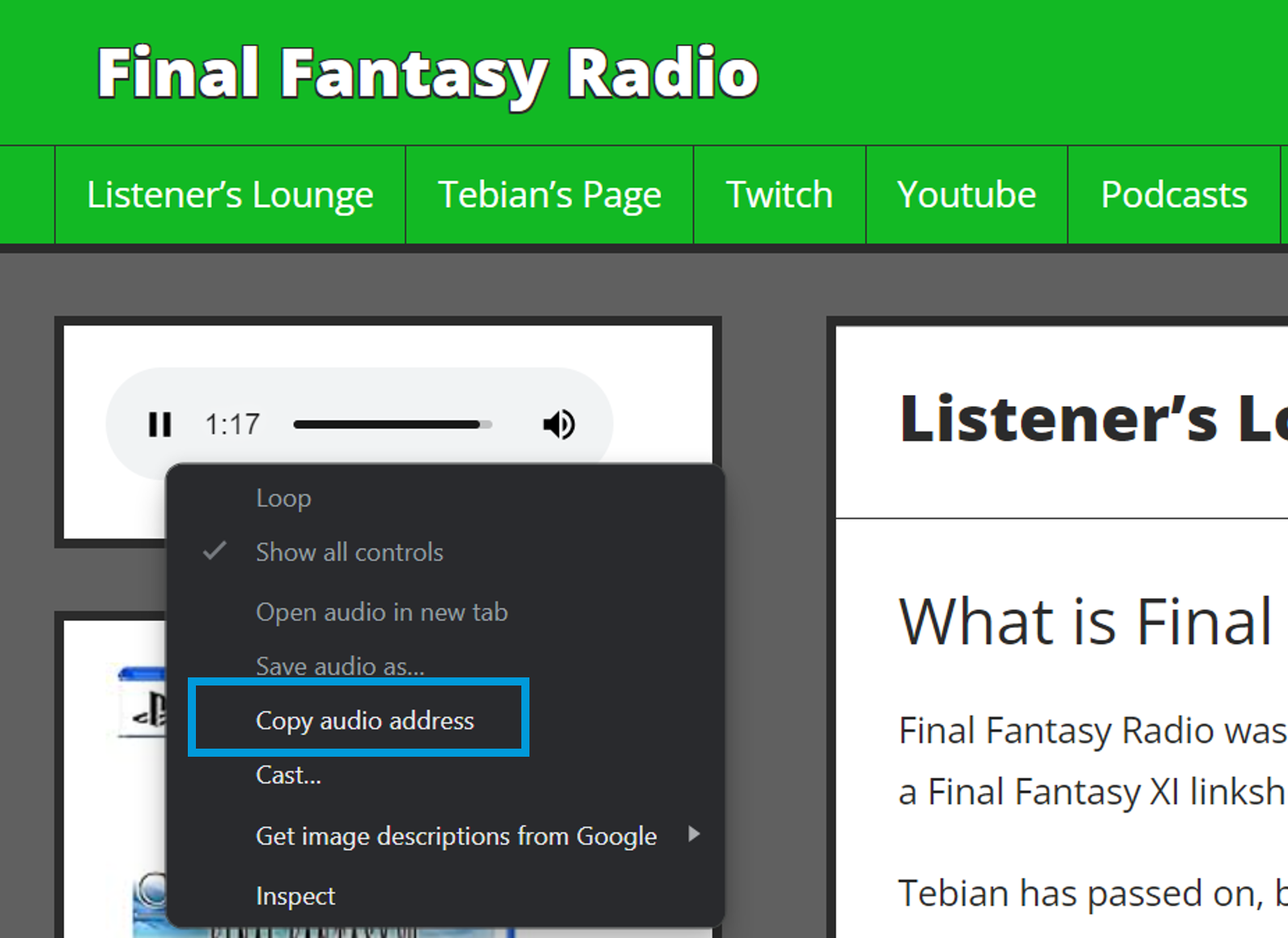 For instance, let us use Final Fantasy Radio for illustration purposes. The following screenshot explains how to copy a radio stream link on Windows.