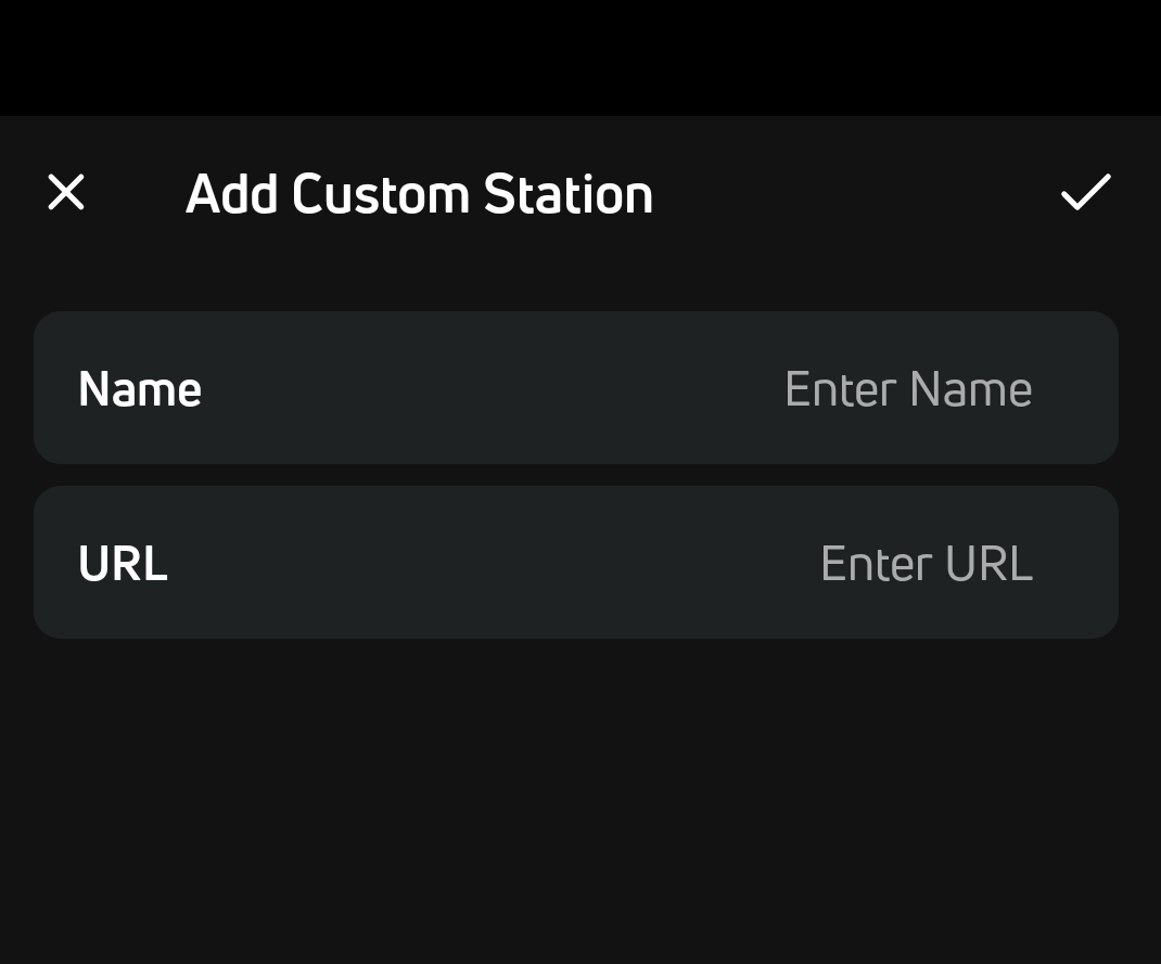 - In the pop-up window that appears, enter the Name you would like this station to appear as and the stream's URL (Internet Audio address1)) and then tap the check mark on the top right.