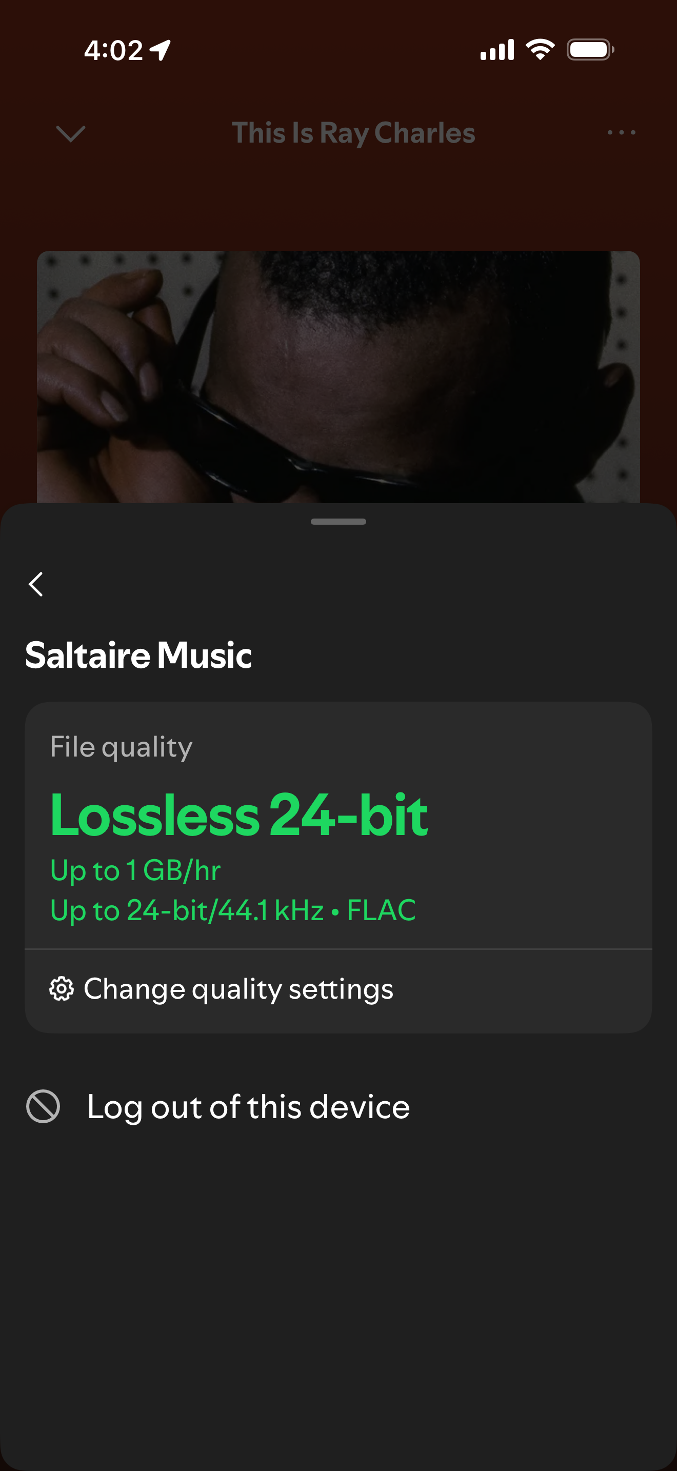 2) To see the bitrate (even if not lossless) that Spotify is streaming to a device, click on the device (for example Saltaire Music in the example above) which will bring you to the Connect menu. Click the arrow next to the device and it will display the bitrate. See below. (Also, where it says "Log out of this device" is what I clicked to "reset" my BluOS device ("Saltaire Music") to allow it to start playing at the lossless setting.