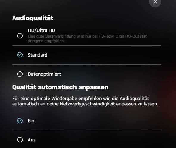 My AM audio settings are Audio Quality HD/Ultra HD, and Auto Adjust Quality for Network Speed. I'm streaming over a gigabit ethernet connection and I have an AM Unlimited subscription in the UK.