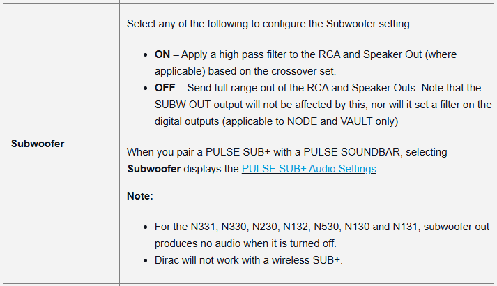 With the release of the NODE N132 and NODE ICON late last year, we have had to make modifications ot the SUB Woofer setting in our NODE family of products to meet DIRAC Calibration requirements. The switch used to be Crossover-enabled or not. This actually confused a number of consumers who implied the setting was Subwoofer on or off, which is in fact what it does now.