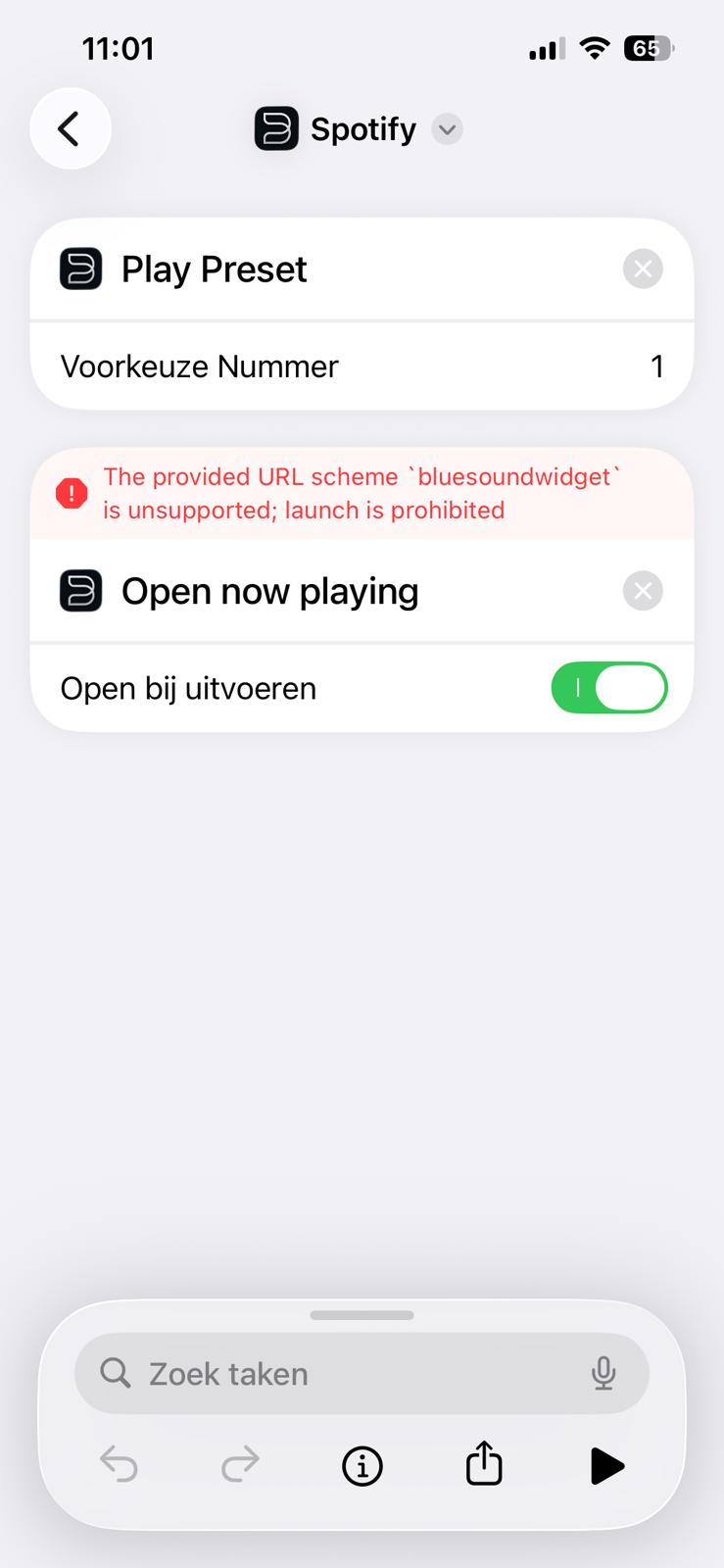i use apple shortcut to open and play the preset 1 and showing the app. Showing app works, but got error message in shortcuts, see picture. how can i solve this problem?